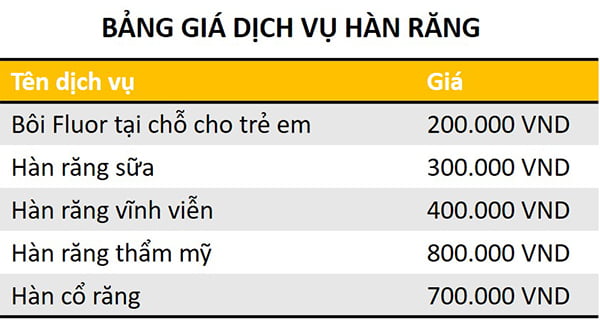 Dưới đây là bảng giá dịch vụ khám, chữa sâu răng (mang tính chất tham khảo